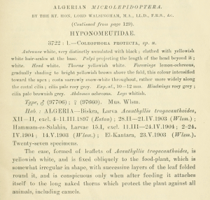 - Erstbeschreibung: Walsingham (1907): Algerian Microlepidoptera. — The Entomologist's Monthly Magazine 43 (= second series 18): 6-10, 55-58, 125-129, 147-154, 187-195. London (Gurney & Jackson).