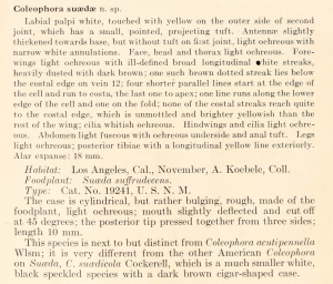 Busck (1915: 88) beschreibt seine neue Art nach der Nahrungspflanze der Raupe: "Foodplant: Suaeda suffrudecens [recte: suffrutescens]." Die Pflanze ist auf Salzböden im Westen Nordamerikas vom Norden Mexikos bis in den Süden Kanadas verbreitet.