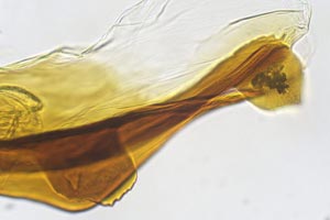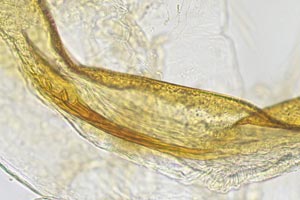 Der Sack ist ca. 7 mm lang, zylindrisch; dunkel rotbraun mit gekörnter Oberfläche und bauchseits leicht gerunzelt. Orale Öffnung parallel zur Längsachse des Sacks (= Öffnungswinkel 0°). Analöffnung dreiklappig. - [Übersetzung: Tina Schulz aus van der Wolf (1992)]