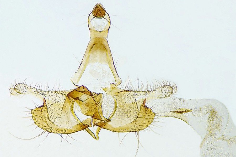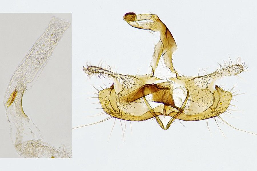 Vergleichende Genitalfotos von Arten mit verdickter Fühlerbasis (Coleophora variicornis, Coleophora hieronella, Coleophora aleramica, Coleophora paramayrella und Coleophora mayrella siehe [Forumsbeitrag von František Kosorín].
