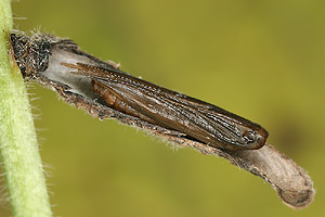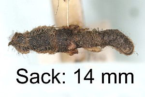 3: zur Verpuppung festgesponnener Raupensack, Daten wie Bilder 1-2 (Foto: Rudolf Bryner)
