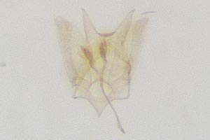 Die Raupen erzeugen oberseitige Faltenminen an Schlehdorn, die an Phyllonorycter-Minen erinnern, im Gegensatz zu diesen aber kotlos sind (Bild 3, Durchlicht). Die Minen entwickeln sich aus einem kurzen Anfangsgang, der sichtbar bleiben kann (Bild 1,3) oder in der Mine aufgehen kann (Bild 2). Bei Lage am Blattrand kann ein Blattumschlag vorgetäuscht werden.