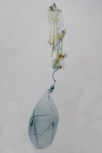 Von einer Gangmine über der Mittel- bzw. einer Seitenrippe zweigen breite platzartige Ausläufer ab. Mine ohne Kot. Die Raupe hält sich in Freßpausen über der Rippe auf und ist dort schwer sichtbar. (Nach Hering 1957)