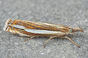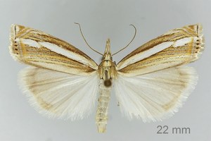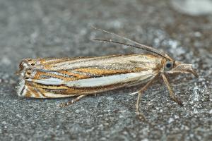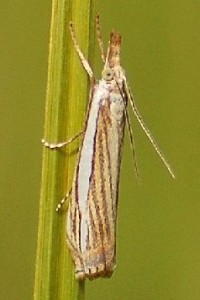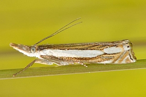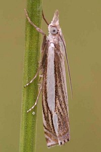 Crambus silvella ist daran erkennbar, dass der äußere, etwas abgesetzte Teil der weißen Strieme nur wenig nach unten versetzt ist (bei bei C. pascuella und C. uliginosellus deutlich nach unten versetzt). [Text: Rudolf Bryner]