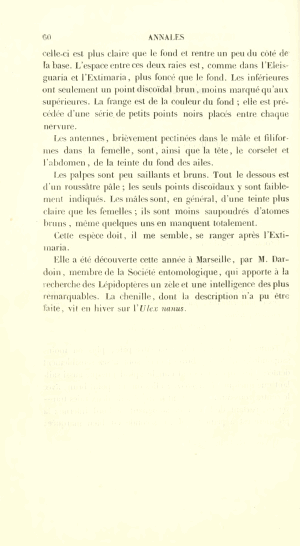 - Erstbeschreibung: Donzel, H. (1840): Description d'une nouvelle phalène du genre Crocallis. — Annales de la Société entomologique de France 9: 59-60, pl. 4 figs. 2 A-B. Paris.