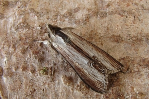 11: Deutschland, Bayern, München, Westkreuz, Wall am Bahnübergang, 530 m, Raupe an Goldrute (Solidago canadensis) 3. August 2023, Falterschlupf 13. April 2024 (leg., det. & Foto: Rosmarie und Siegfried Braun)