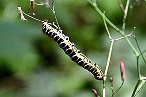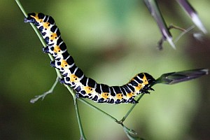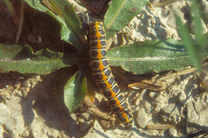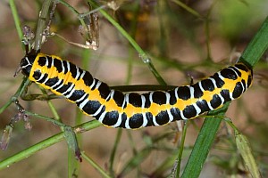 Mit Abstand am häufigsten genutzte Raupennahrungspflanze ist der Hasenlattich (Prenanthes purpurea) an Waldwegen oder in Schlagfluren in Wäldern bodensaurer Mittelgebirge. Wo diese Pflanze naturgemäß fehlt, kann der Kompass-Lattich (Lactuca serriola) die Lebensgrundlage stellen. Andere Lattich-Arten (einschließlich dem Kopfsalat) werden nur ab und zu genutzt, ebenso Gänsedisteln und der Mauerlattich. Bei den Angaben zu "Habichtskraut" ist Vorsicht bezüglich der Bestimmung angebracht. Völlig überraschend war die Forums-Anfrage von [ Angela Kühne, vom 22. November 2012] bezüglich einer in Sachsen an Wiesen-Bocksbart in einem Naturgarten fressenden Raupe, die eindeutig zu C. lactucae gehört.
