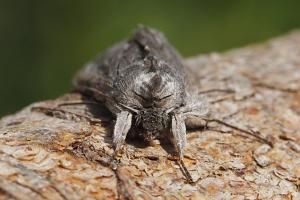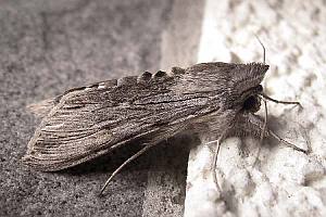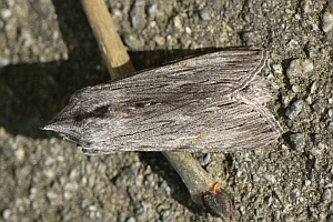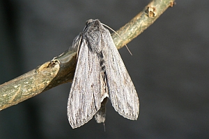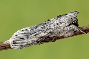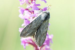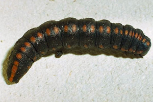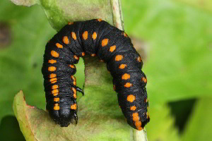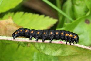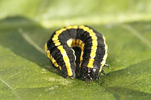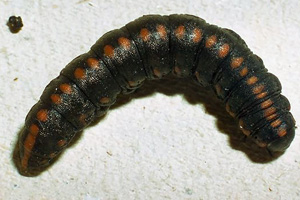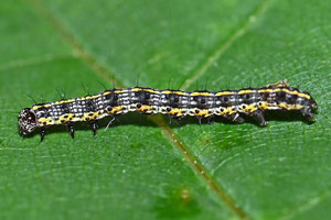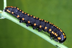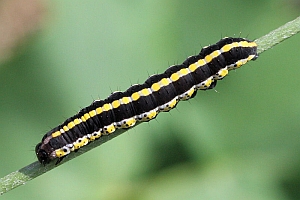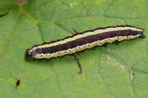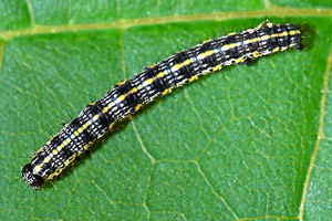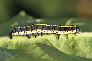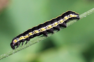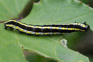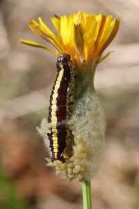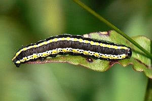 Die jüngere Raupe von Cucullia lucifuga ähnelt der schwarzen Raupenform von Ceramica pisi.