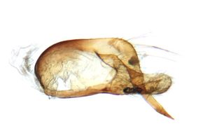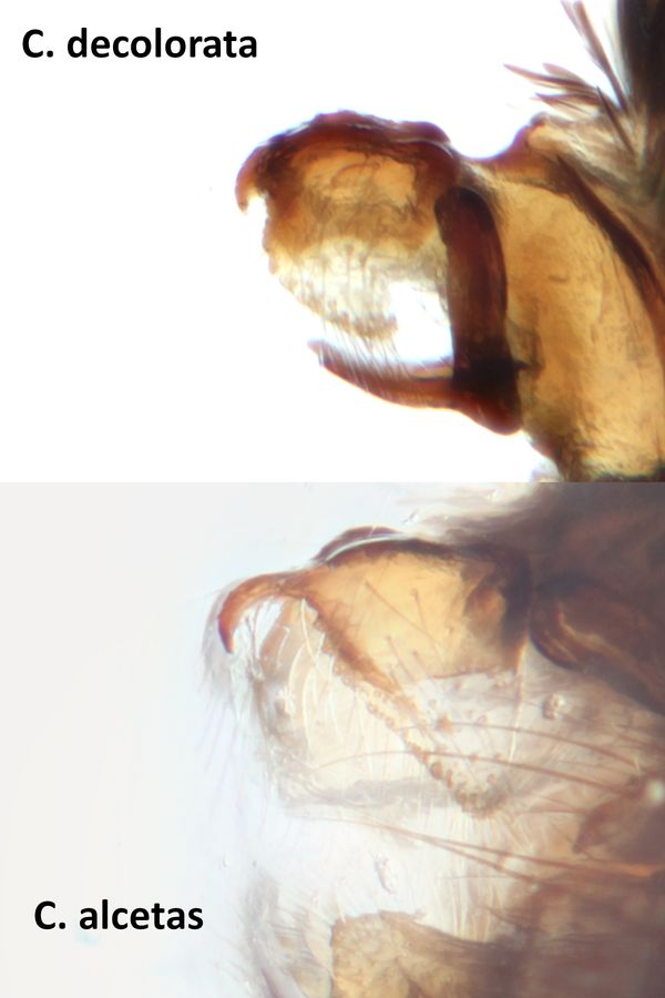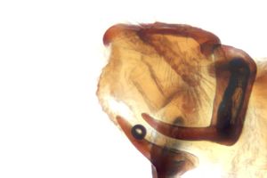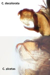 Der wichtigste Unterschied zu Cupido alcetas ist der kurze, stark gebogene Uncusfortsatz. Dies ist in der lateralen Ansicht am besten zu sehen (roter Kreis). (Text Stefan Kirchweger).