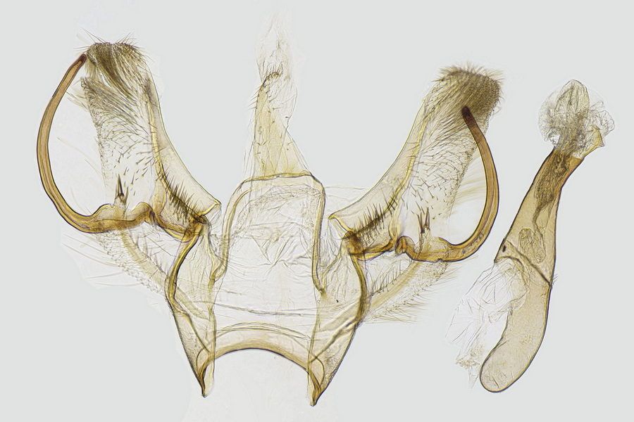 2: Genitalpräparat des als Lebendfalter 13 abgebildeten ♂, Österreich, Steiermark, Graz, St. Peter, ca. 380 m, Garten, Mischwaldrand, in Lichtnähe, 10. Juni 2018 (det., präp. & Foto: Horst Pichler)Forum