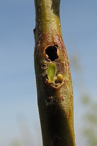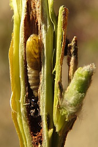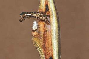 Bei Kennel (1921: 654) ist zu lesen: "Die Raupe ist weißlich mit grauen Punkten, der Kopf schwarz, Nacken- und Analschild sind braun; sie lebt von August bis April in Zweiganschwellungen von Salix caprea, seltener in anderen Salixarten. Der Falter fliegl im Mai und Juni."
