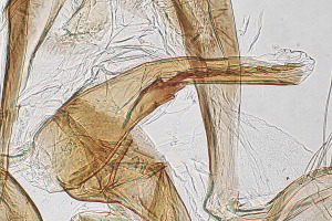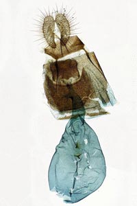 Die geöffnete Galle zeigt einen kurzen, rund 3 cm langen, im oberen Teil mit Seide ausgesponnenen Frassgang im Bereich der Knospe, welche der Raupe als Eintritt gedient hat. Das Schlupfloch befindet sich am oberen Ende der Galle und soll in manchen Fällen sogar bis 4 mm oberhalb derselben münden (Bradley, Tremewan & Smith (1979): British Tortricoid Moths: Tortricidae: Olethreutinae. The Ray Society, London: p.262).