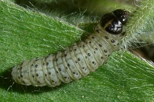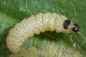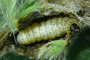 1: vorletztes Stadium, Deutschland, Sachsen, Doberschütz, Bahngelände, Raupe minierend an Natternkopf (Echium vulgare) 7. Mai 2008 (Foto: Heidrun Melzer), cult. & det. Heidrun MelzerForum