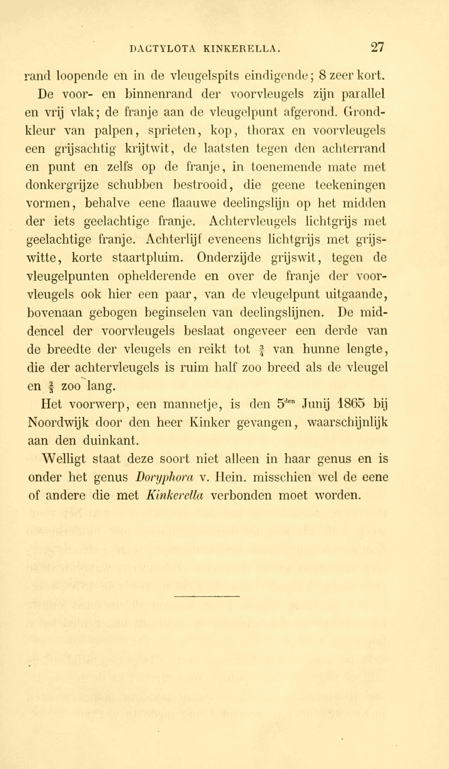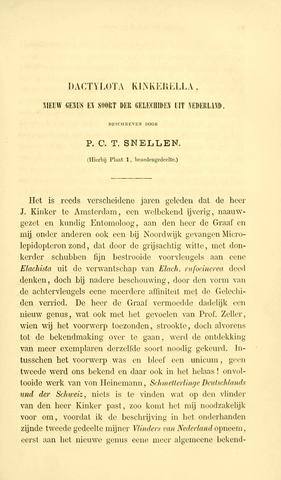- Erstbeschreibung: Snellen, P. C. T. (1876). Dactylota Kinkerella, nieuw genus en soort der Gelechiden uit Nederland. — Tijdschrift voor entomologie 19: 23-27 + pl. 1. 's Gravenhage (Martinus Nijhoff).