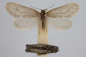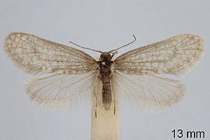 Bestimmungswichtige Merkmale sind bei den Männchen der Genitalindex (Aedoeaguslänge durch Valvenlänge) sowie die Form der Schuppen am Vorderflügel zwischen Diskoidalzelle und Apex („Schuppenklassen“ 1-6), bei Weibchen die Kopf-Brust-Platte der Exuvie und die Form der Dornen des „Genitalfeldes“, genauer des Dorsalfeldes. (Die Position der bestimmungsrelevanten Dornen wurde am Präparat mit einem roten Kreis markiert. Diese Dornen sind winzig klein, das Foto wurde im Mikroskop mit 400-facher Vergrößerung aufgenommen).