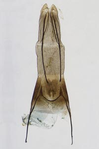 "♂: Gross, breitflügelig, Flügelform wie triquetrella. Weisse Flecke der Vorderflügel klein und scharf (also ähnlich wie bei manni oder pineti, während sie bei triquetrella meistens grösser sind). Am Ende der Discoidalzelle ein grosser, dunkler Fleck vorhanden. Deckschuppen erheblich breiter als bei triquetrella, 4—6zackig, mindestens so breit wie bei den breitschuppigsten mir vorliegenden pineti-Tieren. Fransen grau, kaum heller als die Flügelgrundfarbe. Vorderflügellänge 8,3 mm. Vordertibie ohne Sporn (d. h. wie triquetrella, während sie bei pineti einen Subapicalsporn besitzt).