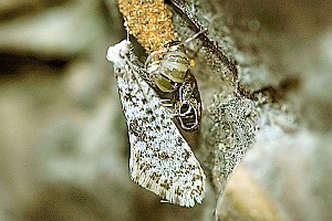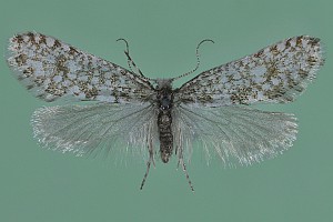 Männchen: Mittelgroße Falter mit einer Flügelspanne von 10,0 bis 13,5 mm. Vorderflügel weißlich, insbesondere bei frischen Exemplaren mit bräunlicher Gitterung, die im Saumbereich am deutlichsten ausgeprägt ist. Stirnschopfbehaarung sehr lang, weißlich, gelblich bis bräunlich.