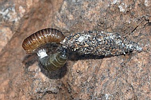 Sack: Klein, um 5 - 6,5 mm lang und um 2 mm im Durchmesser, rotbraun bis mittelbraun, teilweise auch graubraun, meist dreikantig. Die Säcke sind belegt mit kleinen unterschiedlichen Gesteinspartikeln, die dem Sack ein farblich differenziertes Aussehen verleihen.