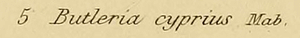 - Butleria cyprius Mabille, 1898 [Originalkombination]