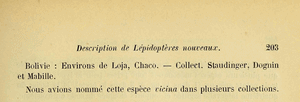 - Erstbeschreibung: Mabille, P. (1898): Description de lépidoptères nouveaux. — Annales de la Société entomologique de France 66 (2-3): 182-231, pl. 9. — Digitalisat auf biodiversitylibrary.org: [202], [pl. 9 fig. 3]
