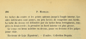 - Erstbeschreibung: Mabille, P. (1898): Description de lépidoptères nouveaux. — Annales de la Société entomologique de France 66 (2-3): 182-231, pl. 9. — Digitalisat auf biodiversitylibrary.org: [205]
