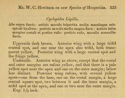 • Erstbeschreibung: Hewitson, W. C. (1877): Descriptions of twenty-three new Species of Hesperidae from his own Collection. — The Annals and Magazine of Natural History, Zoology, Botany, and Geology. Fourth Series 20: 319-328. London (Taylor and Francis). — Digitalisat auf biodiversitylibrary.org: [325]
