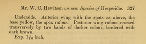 - Erstbeschreibung: Hewitson, W. C. (1877): Descriptions of twenty-three new Species of Hesperidae from his own Collection. — The Annals and Magazine of Natural History, Zoology, Botany, and Geology. Fourth Series 20: 319-328. London (Taylor and Francis). — Digitalisat auf biodiversitylibrary.org: [326]