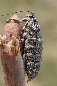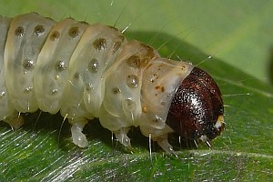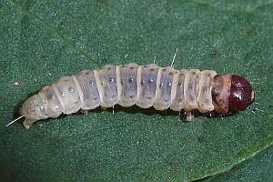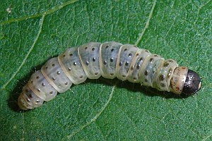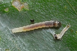 Schütze (1931) schrieb: "An Salix, Alnus, Betula, Acer, Rosa, Prunus spinosa, Myrica, Berberis, Cornus mas, Rubus zwischen zwei versponnenen Blättern oder in einem umgeklappten Blattrande, Verwandlung meist vor dem Winter in der engversponnenen Wohnung (Sorhagen). Zwischen Blättern von Wollweiden und Salix repens (Wocke)." Unsere obige Liste von Laubgehölzen ist sicher noch nicht vollständig.