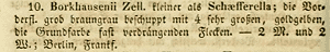 Disqué (1895) berichtet aus Speyer am Rhein (Deutschland, Rheinland-Pfalz): "Die Lebensweise der Raupe dieser prächtigen Art war meines Wissens bis jetzt noch nicht bekannt. Man vermuthete nur, daß sie an Kiefern lebe, da der Falter fast stets an deren Stämmen gefunden wurde. Anfangs Juni d. J. fand ich etwa sechs kleine weißliche, sehr schlanke Räupchen, die zwischen der sich abschiefernden Rinde genannten Baumes unter dünnem mit Raupenkoth gemischtem Gespinnst lebten. Am 15. Juli und 1. August schlüpfte je eine Borkhausenii, die mich um so freudiger überraschte, als dieser Falter noch nie hier oder überhaupt in der Pfalz gefunden worden war."
