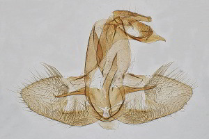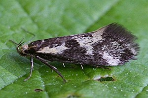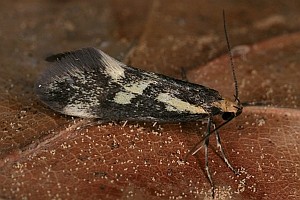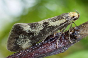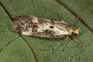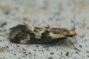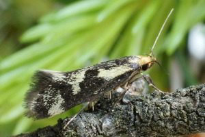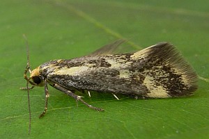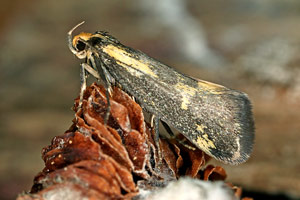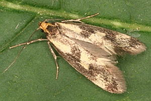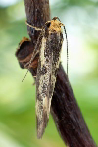 Denisia stipella hat einfarbig dunkle Fühler, einen rein gelben Kopf und ein dunkles Palpen-Endglied mit höchstens angedeutet gelber Spitze (rechtes Bild). (Rudolf Bryner)