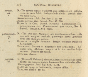 - Erstbeschreibung: Haworth, A. H. (1803-1828): Lepidoptera britannica; sistens digestionem novam insectorum lepidopterorum quæ in Magna Britannia reperiuntur, larvarum pabulo, temporeque pascendi; expansione alarum; mensibusque volandi; synonymis atque locis observationibusque variis: I-XXXVI, 1-609. Londini (R. Taylor). — Digitalisat von Google Books auf www.archive.org: [176].