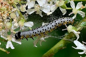 2-3: Deutschland, Schleswig-Holstein, Liether Kalkgrube bei Elmshorn, Jungraupengespinste in Blütenstanden von Pastinak (Pastinaca sativa), 28. Juni 2008 (Freilandfotos: Heidrun Melzer)