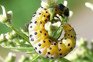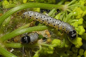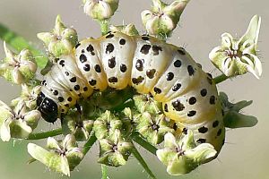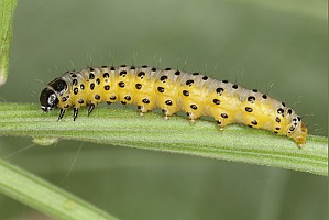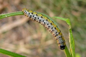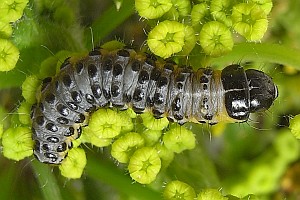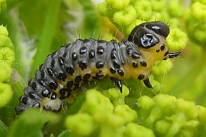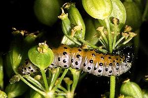 1: vorletztes Stadium, Deutschland, Schleswig-Holstein, Liether Kalkgrube bei Elmshorn, an Pastinak (Pastinaca sativa), 28. Juni 2008 (manipuliertes Freilandfoto: Heidrun Melzer), leg., cult. & det. Heidrun MelzerForum
