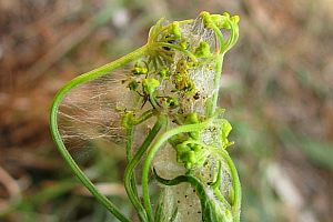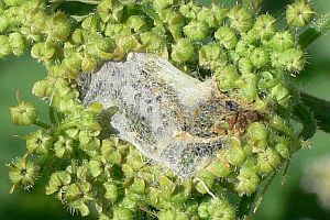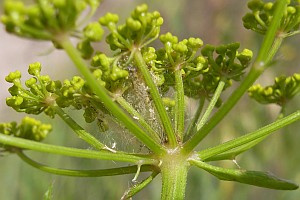 1: Deutschland, Thüringen, Leutra bei Jena, Wiesenbrache, Raupengespinst in Blütenstand von Pastinak (Pastinaca sativa), 23. Juli 2008 (Freilandfoto: Heidrun Melzer)