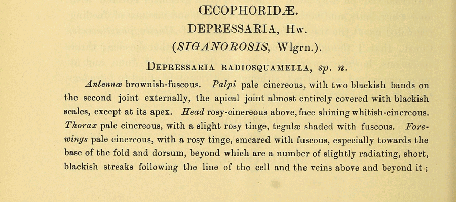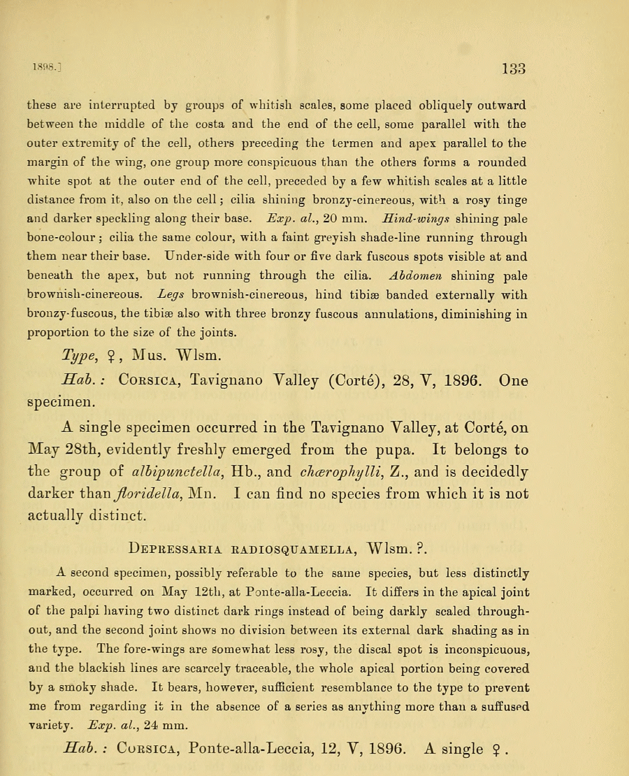 - Erstbeschreibung: Walsingham (1898): New Corsican Micro-Lepidoptera. — The Entomologist's Monthly Magazine. Second Series 9 (= 34): 131-134, 166-172. London (Gurney & Jackson).