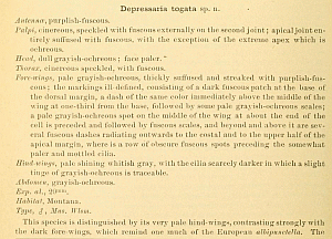 - Erstbeschreibung: Walsingham, B. (1889): Steps towards a revision of Chambers' index, with notes and descriptions of new species. — Insect Life 1 (8): 254-248.