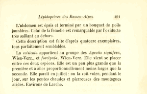 - Erstbeschreibung: Bellier de la Chavignerie (1859): Observations sur les lépidoptères de Basses-Alpes Environs de Larche. — Annales de la Société entomologique de France 7: 177-193, pl. 5.