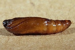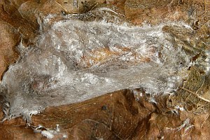 4: Verpuppungsgespinst, Deutschland, Sachsen, Dübener Heide, Umgebung von Doberschütz, leg. Raupe 9. Juli 2008, verpuppt nach Überwinterung, 7. April 2009 (Foto: Heidrun Melzer), cult. & det. Heidrun Melzer
