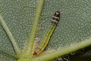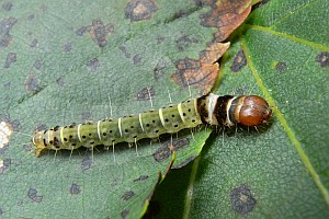 1: vorletztes Stadium, in Häutungsruhe, Deutschland, Sachsen, Dübener Heide, Umgebung von Doberschütz, an Bergahorn (Acer pseudo-platanus), leg. 9. Juli 2008,26. Juli 2008 (Foto: Heidrun Melzer), leg., cult. & det. Heidrun Melzer