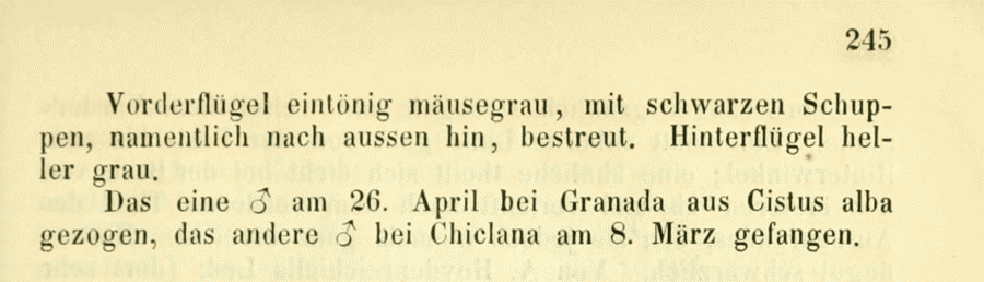 Ein Männchen der Typenserie wurde bei Granada aus "Cistus alba" gezogen; was damit gemeint war, ist nicht ganz klar: In Frage kommen die weiß blühende Montpellier-Zistrose (Cistus monspeliensis), die ebenfalls weiß blühende Lack-Zistrose (Cistus ladanifer) und die rosa blühende Weißliche Zistrose (Cistus albidus) mit ihren silbrigweißen Blättern.