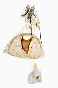 In den männlichen Genitalien von Dichrorampha acuminatana sind neben der Valvenform auch die geigenförmige Platte unter der Aedeagus-Basis und die zweispaltige Aedeagus-Mündung charakteristisch.