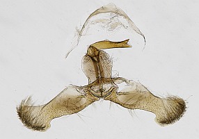 In den männlichen Genitalien von Dichrorampha acuminatana sind neben der Valvenform auch die geigenförmige Platte unter der Aedeagus-Basis und die zweispaltige Aedeagus-Mündung charakteristisch.