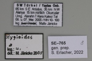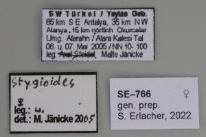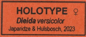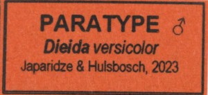 Japaridze & Hulsbosch (2023: 170): “Deposition of type material: Museum für Naturkunde Gera. [...] Holotype ♀ (Fig. 3C, D): ‘SW Türkei / Yaylas Geb. | 85 km SE Antalya, 35 km | Alanya. 15 km nörtlich Okuncalar | Urng. [sic, recte: Umg. (Anm. Jürgen Rodeland)] Alarahn / Alana Kalesi Tal | 06. U. 07. Mai 2005 / NN 10- 100 | leg. Axel Steidel [durchgestrichen], Malte Jänicke’, ‘Stygioides | ♀ | leg.: |—|. | det.: M. Jänicke’, ‘SE-766 ♀ | gen. prep. | S. Erlacher, 2022’, <red label> ‘HOLOTYPE ♀ | Dieida versicolor | Japaridze & Hulsbosch 2023’ Paratype 1 ♂ (Fig. 3A, B): same data as holotype, gen. prep. SE-765.”