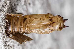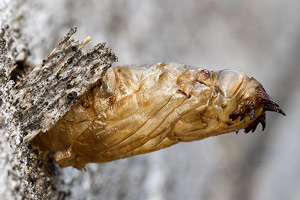 8-9: Exuvie einer Raubfliege (Choerades sp., det. Markus Gebel), aus totem Nadelbaum ragend: Deutschland, Bayern, Krailling, ehem. Truppenübungsplatz, 560 m, 29. Mai 2021, Tagfund (Freilandfotos: Markus Welz)Forum