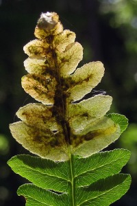 2-3: Platzmine mit Larve von Chirosia histricina (Anthomyiidae): Deutschland, Niedersachsen, Landkreis Hannover, Ahltener Wald bei Hannover, 77 m, an Adlerfarn (Pteridium aquilinum), 19. Juni 2017 (det. & fot.: Tina Schulz)