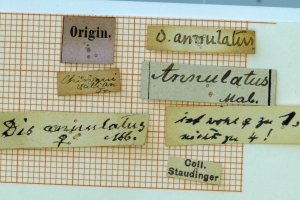 1-3: ♀ Holotypus von Dis annulatus, Daten siehe Etiketten (fot.: Ernst Brockmann, Fotos bearbeitet: Michel Kettner), coll. Zoologisches Museum der Humboldt-Universität zu Berlin.