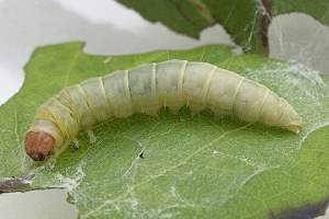 Die (ältere) Raupe verbringt die ganze Zeit in dem Gehäuse, das durch das Aufeinanderspinnen von 2 Blättern entsteht und ernährt sich darin durch Schabefraß. Durch diesen fällt diese Wohnung auf. Später verlässt die Raupe dieses Gehäuse v.a. nachts, um die Blätter abseits der zusammengesponnenen Fläche vom Rand her zu befressen, dabei werden auch die Blattadern völlig verzehrt. Raupen wurden an Buche (Fagus sylvatica), Feldulme (Ulmus minor) und Birke (Betula pendula) gefunden. (Zuchtbeobachtung Peter Buchner)