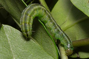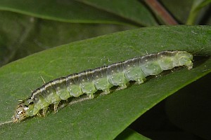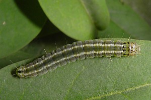 Kennel (1910: 221) meinte: "Die Raupe ist olivgrün, die breite Dorsallinie und die schmäleren Subdorsallinien sind dunkler; der Kopf ist rotbraun, das Nackenschild gelbgrün, schwarz punktiert. Sie lebt zwischen versponnenen Blättern und Trieben von Berberis vulgaris, Ligustrum, Lonicera caerulea, caprifolium und xylosteum im Juni und Juli, an manchen Stellen recht häufig."