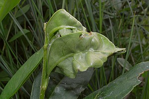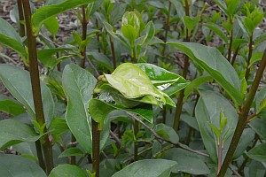 Schütze (1931) hatte beim Liguster geschrieben: "Die dunkelgrüne Raupe bis Juni in einer umgebogenen Blattspitze (Schmid), zwischen versponnenen Gipfelblättern (Disqué), auch an Lonicera xylosteum und Berberis (Sorhagen)." Auch wenn Razowski (2001: 46) die beiden Pflanzen ebenfalls nennt, dürfte es hierzu keine seriöse Grundlage geben. Schwieriger zu beurteilen ist die von Razowski (2001: 46) ebenfalls angeführte Esche (Fraxinus) - sie gehört ja zur selben Familie wie der Liguster, doch konkrete Fundmeldungen dazu kann ich nicht finden. Interessant in diesem Zusammenhang ist der Fund einer Raupe an einem anderen Ölbaumgewächs, dem Gewöhnlichen Flieder am 3. Mai 2020 durch [Gabriele Kemus (Forum)] in einer Weinbergsböschung im Kaiserstuhl. Der Flieder ist dort vielfach verwildert und tritt an ähnlichen Stellen auf wie der Liguster - so könnte es durchaus sein, dass der Flieder dort nicht nur ausnahmsweise mitgenutzt wird.