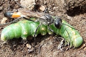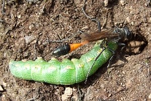 1-4: Grabwespe (Ammophila sabulosa, det. Klaus Rennwald) vergräbt erbeutete Raupe (det. Thomas Fähnrich): Deutschland, Rheinland-Pfalz, Lkr. Bad Kreuznach, Neu-Bamberg, Heidegebiet, 19. September 2010 (Fotos: Gerhard Schwab)Forum